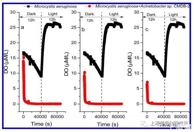 圖4、在不同密度的初始細菌培養體系中,微囊藻的和不動桿菌的培養體系環境中測試的氧濃度剖面分析圖。圖(a)表示的是含有不動桿菌菌屬和銅綠微囊藻FACHB905,其中CMDB-2生物量濃度是是1×103個細胞/毫升;(b)表示的是最初的不動桿菌菌屬,其中CMDB-2生物量是1×105個細胞/毫升;圖c表示的是最初的不動桿菌sp。CMDB-2生物量是1×107細胞/毫升。實驗是在受控實驗室條件下進行。在40umol光子/(m2·sec)和12 h/12 h(光/暗)周期內。