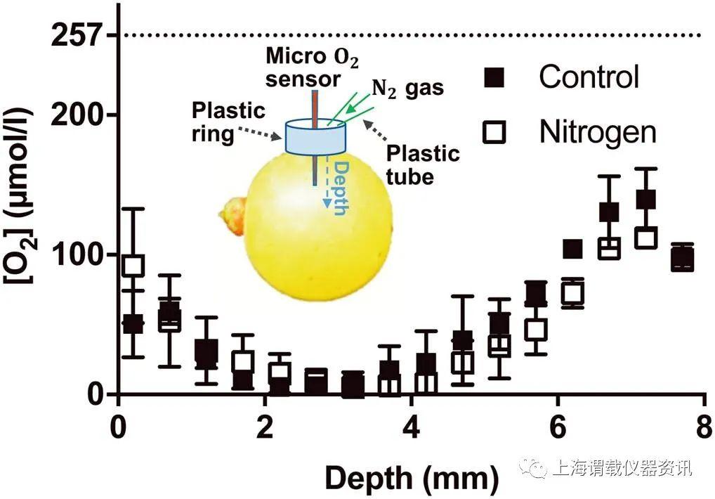 圖1、在測量過程中加入和不加入N2氣體的霞多麗品種的葡萄漿果的氧的濃度剖面圖。插圖:測量葡萄漿果的氧的濃度剖面的實驗裝置示意圖。O2微電極傳感器(尖端直徑25μm)插入到葡萄漿果和向內移動到中心的位置。在微電極的傳感器的入口周圍,一個塑料環被密封并粘在漿果上,包含氮氣輕輕地流向傳感器的入口點。