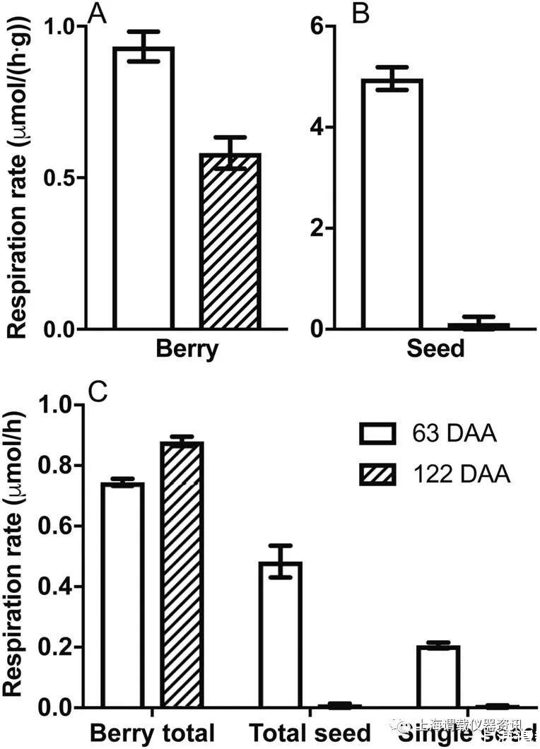 圖4、2015-2016年,63天和122天生長的霞多麗品種的葡萄漿果和其對應的葡萄籽在25°C下測試獲得的的呼吸速率。圖A表示測試的是葡萄果肉的呼吸速率、圖B表示的是葡萄籽的呼吸速率。圖C表示的是比較單個葡萄漿果(含葡萄籽)、所有的葡萄籽、單個葡萄籽的呼吸速率。