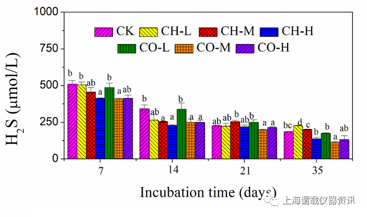 圖2、對(duì)分批試驗(yàn)方案一中處理土壤中H2S的生產(chǎn)進(jìn)行原位的檢測。所示數(shù)據(jù)為平均值±SD。柱上不同的字母表示不同處理之方法間對(duì)應(yīng)的硫化氫濃度的顯著差異。