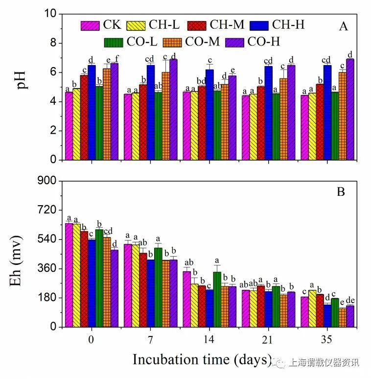圖1、pH(A)和氧化還原電位Eh(B),歸一化至標(biāo)準(zhǔn)氫電極)在土壤中不同時(shí)間內(nèi)分批實(shí)驗(yàn)處理。所示數(shù)據(jù)為平均值±SD(n=3)。柱上不同字母表示處理間差異顯著。