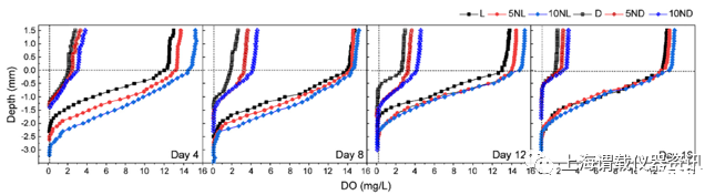 圖1、實驗過程中不同處理方式在土壤-水界面的溶解氧濃度變化。