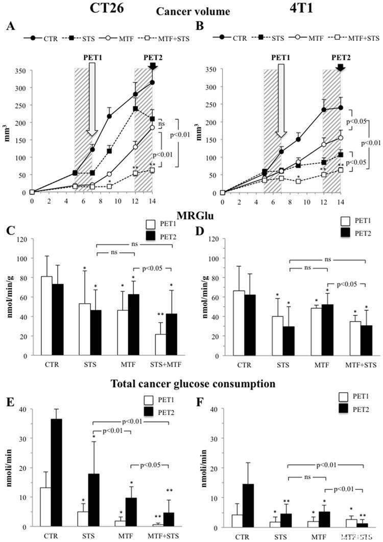 圖1、二甲雙胍藥物療法和饑餓療法對于腫瘤細胞的生長及其葡萄糖能量代謝的影響。圖A,B表示的是老鼠體內注入CT26癌細胞和4T1細胞后進行喂養14天,通過使用不同的治療方法判斷老鼠體內腫瘤體積大小的變化情況。圖C、D表示的是采用18F-FDGPET掃描法測試老鼠體內腫瘤細胞的消耗葡萄糖代謝率水平的大小。圖E、F表示的是老鼠體內癌細胞葡萄糖消耗總量水平的大小。從圖A、B中可以看出,當通過使用能量代謝干擾法和饑餓療法時,老鼠體內腫瘤體積增長較慢,對于腫瘤的生長抑制更好。圖C、D反映的是腫瘤細胞葡萄糖代謝率的水平,當使用二甲雙胍藥物療法和饑餓療法時,腫瘤細胞的葡萄糖代謝率有所降低。圖E、F也進一步證明了該結論,即使用了STS、MTF療法后,腫瘤細胞消耗葡萄糖的量也減少了。