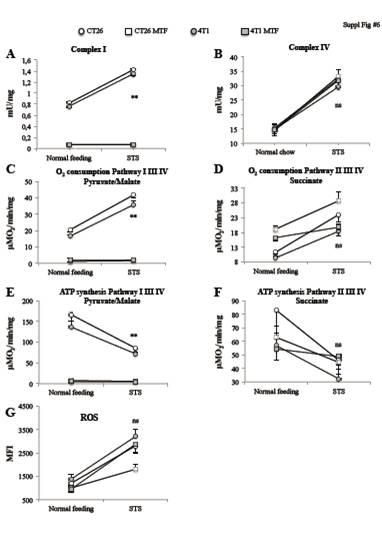 圖2、老鼠體內癌細胞進行線粒體呼吸鏈系統的過程。其中○(CT26細胞)□(CT26+MTF)●(4T1)■(4T1+MTF)圖A、B表示的含有不同癌細胞的老鼠體內生成的線粒體呼吸鏈復合物Ⅰ和復合物Ⅱ的量變化。圖C、D表示的是細胞進行線粒體有氧呼吸時,其線粒體呼吸鏈過程中氧氣的消耗速率的變化情況。圖E、F表示的是細胞進行線粒體有氧呼吸時,其線粒體呼吸鏈過程中ATP的變化情況,圖G是表示這個過程中活性氧的變化情況。
