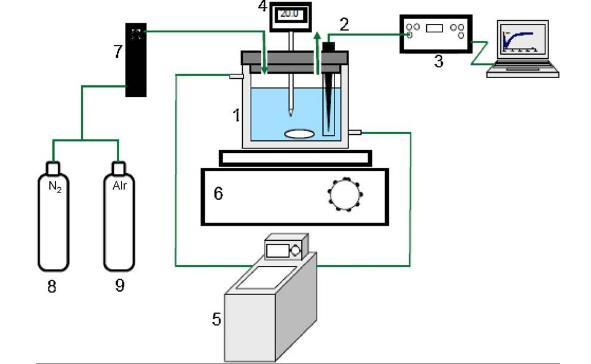 圖1、試驗裝置用于測量氧擴散系數:(1)雙壁船,(2)Unisense氧微電極,(3)數據采集系統,(4)溫度計(5)恒溫水浴(6)磁力攪拌器(7)氣體流量計(8)氮氣供應瓶、(9)空氣供應瓶、(10)三通閥