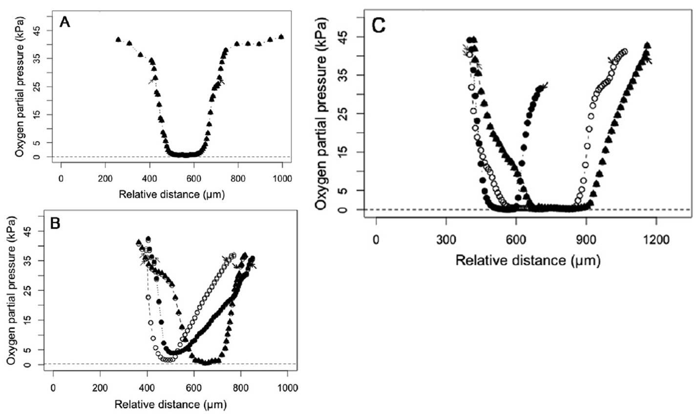 圖2、黑翅土白蟻主要腸腔室的氧分壓的徑向分布。圖A表示的是黑翅土白蟻腸道系統從腸壁到腸隔室中心的徑向氧含量分布。圖B表示的是黑翅土白蟻中腸中間的氧濃度從腸壁到內腔中心的變化情況?!瘢ㄇ澳c)△(中腸)○(中腸的后半部分)圖C表示的是腹和結腸(后腸)區域內的氧分壓分布情況。●(前腹)△(后胃)○(后腸)。