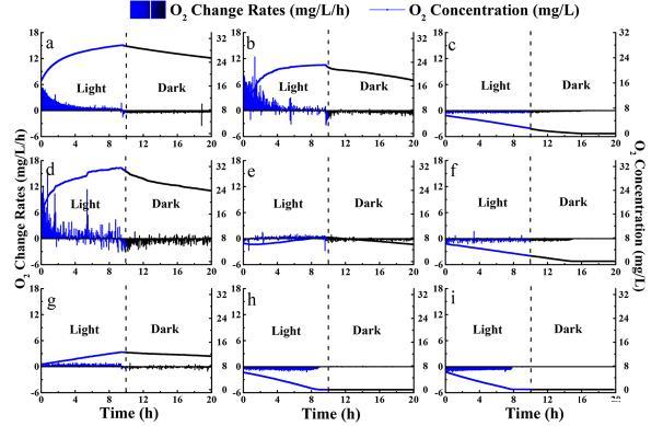 圖4、不同條件處理組的銅綠假單胞菌培養60天后的光合作用和呼吸速率。其中左邊對應的是氧的呼吸速率變化值,右邊的圖是氧濃度變化值。(a)8°C-對照組,(b)25°C-對照組,(c)35°C-對照組;(d)8°C?絮凝處理組,(e)25°C?絮凝處理組,(f)35°C?絮凝處理組;(g)8°C?絮凝封蓋處理組,(h)25°絮凝封蓋處理組,(i)35°絮凝封蓋處理組。從圖中可以看出綠膿桿菌細胞在經過絮凝和封蓋處理后其光合作用和呼吸速率收到嚴重的阻礙(圖h、圖i),并導致藻細胞的分解,這說明絮凝封頂處理可加速藻華的死亡。