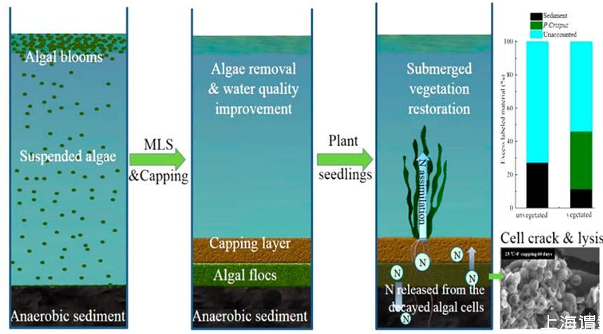 研究人員提出了在不同的溫度(8和25℃)下,采用工程學方法的可以使藻華向大型植物的轉變和藻類營養物質的轉移的過程變得更容易。結果表明,絮凝與封頂處理相結合,不僅可以去除富營養化水體中的銅綠微囊藻華,而且可以促進藻類的分解,使其成為水下大型植物(菹草)所需的生物量。絮凝封頂處理可引起藻細胞裂解。與對照組相比,絮凝-封頂處理組抑制了藻類的光合作用和呼吸速率,葉綠素-a的濃度顯著降低。15N示蹤研究表明,在8℃和25℃條件下,水下大型植物(菹草)可分別吸收3.3%和34.8%的藻類氮源。研究表明絮凝-封頂法可以促進藻類向大植物為主狀態的轉化,這個過程是水生生態系統修復的關鍵。