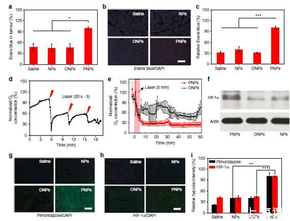 圖2、體內缺氧PNPs介導的滲透性增強和缺氧的長期效應。圖a)腫瘤中埃文斯藍積累的分析,24小時后靜脈注射脫氧PNPs。用紫外-可見分光光度法(UV-vis)測定腫瘤中埃文斯藍的含量。圖b)體外熒光圖像的伊文思藍(紅色)和4‘,6-二脒基-2-苯基吲哚(DAPI)(藍色)染色(圖中的比例尺存是100μm)。圖c)定量Evans藍在b中的累積量。圖d腫瘤內注射脫氧PNPs和油納米顆粒后溶氧(DO)的變化。圖e)腫瘤內注射缺氧PNPs和ONPs(比例尺寸,100μm)24小時后體現的免疫熒光圖像的低氧factor-1α(HIF-1α)(綠色)染色部分。(f)量化HIF-1α表達數。