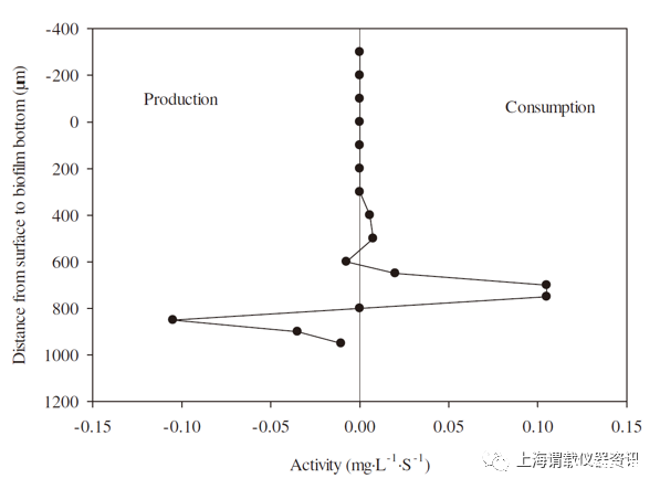 圖3、OSPW生物膜中的H2S凈比消耗和生產率(生物膜-本體液界面以0μm的距離表示)。從圖中可看出最高硫酸鹽還原活性被發現在850微米的大體積的水生物膜界面下方,而硫化物氧化發生650-800微米的界面下方與特定活性。這是由于該區域內存在氧氣,產生的H 2 S可能會被氧化,從而導致較高的硫化物氧化活性。