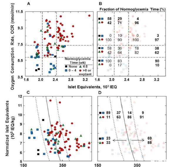 圖5、動物的正常血糖時間與胰島植入動物前的動物體內的胰島參數相關數據之間的關系。維持正常血糖的時間分別為(1)0周,(2)大于0-4周,(3)4-8周,(4)8周或仍在正常血糖的情況下進行移植的。圖A表示的是每個動物的基準點在相應的OCR和IEQ的數量上繪制的。圖B表示的是各區域不同時間的正常血糖分數(小于4周時間和大于4周時間)。圖C表示的與圖(A)相同的IEQ/kg和OCR/DNA坐標上繪制的數據。圖D的數據是與圖B相同的各區域正常血糖分數與時間的關系。