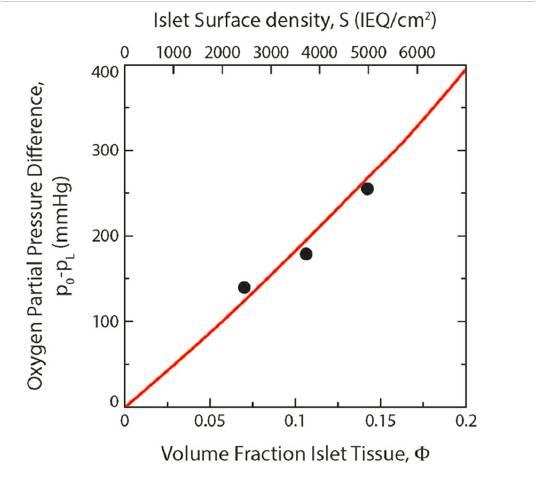 圖4、氧分壓差與胰島組織體積分數或胰島表面密度的關系。圖中的所取的點是不同密度的胰島(S=2,400、3,600和4,800 IEQ/cm2)對應的數據點。