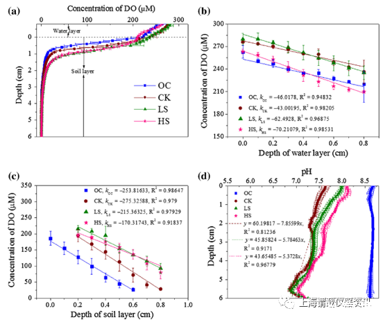 圖1、原位溶解氧(a),水層(b)和土壤(或沙/土混合)層(c)線性區域的擬合,原位pH(d)作為土壤MFC深度的函數。OC-開路控制,無沙塵。隨著深度的增加,所有樣品中的DO濃度均降低(圖a所示)。表層土壤的DO(深度0-1厘米)顯示出在水層中更快的下降。DO的擴散系數(Ds)隨著添加的沙量的增加而增加。與開路控制的土壤pH相比,所有活性MFC(CK,LS和HS)的pH(平均值)降低了1.1-1.4個單位(圖d所示)。