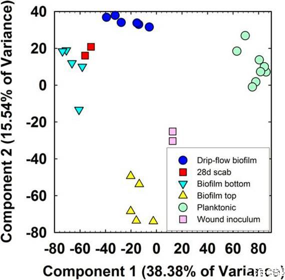 圖5、微陣列數據的主成分分析集。采用了PCA對小鼠分組進行可視化傷口痂微陣列數據(■)比較發布參考數據集。所有使用假單胞菌菌株PAO1,包括浮游生物的研究,連續生長流動生物膜反應器和從活動頂部(△)的標本獲得的24個完整的生物膜,且屬于活動較少生物膜菌落(△),還包括在小鼠傷口模型中的菌落生物膜制劑用作接種劑。