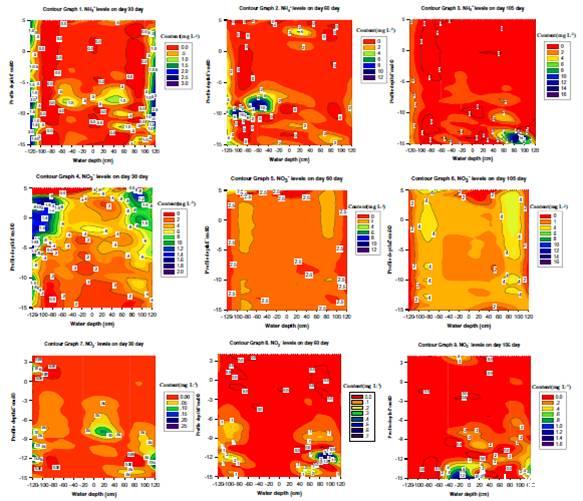 圖3、研究周期為105天時間內,垂直水柱變化和孔隙水中NO3?、NO3?、NH4+濃度變化的二維等高線圖。其中水深度的負值代表了在再生根中的大塊土壤中生物群體,而為正值反映了蘆葦根系周圍的生物群體。其中水的深度表示如上圖1描述所示。
