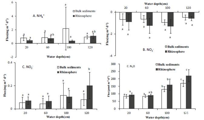 本論文研究了南方生長的蘆葦中溶解的無機氮分布的差異與深度相關性。通過研究根際和非根際沉積物可以確定它們是否加速了N2O的釋放和無機氮的釋放。研究發現靜水深度的變化和南方蘆葦的生長都有可能破壞孔隙水中的溶解NH4+、NO3?、NO2-的剖面濃度分布,而NO3?會隨著深度顯著降低表現出很強的表面聚合傾向。與此相對應,在深水中和淺水中蘆葦根系中檢測到了最高濃度的NO2?成分。相比與NH4+、NO3?、NO2-,從根系釋放NO2-通量對水深的影響很敏感,尤其是水深深度超過1米,NO2-通量顯著增加,而N2O的排放也隨著水深深度的增加而明顯加快,然而來自根際的N2O排放更容易受蘆葦自身的控制。經過皮爾森相關分析理論表明,一氧化二氮排放和NO2?通量與水深度顯著相關,而一氧化二氮的排放也與NO2?通量息息相關。