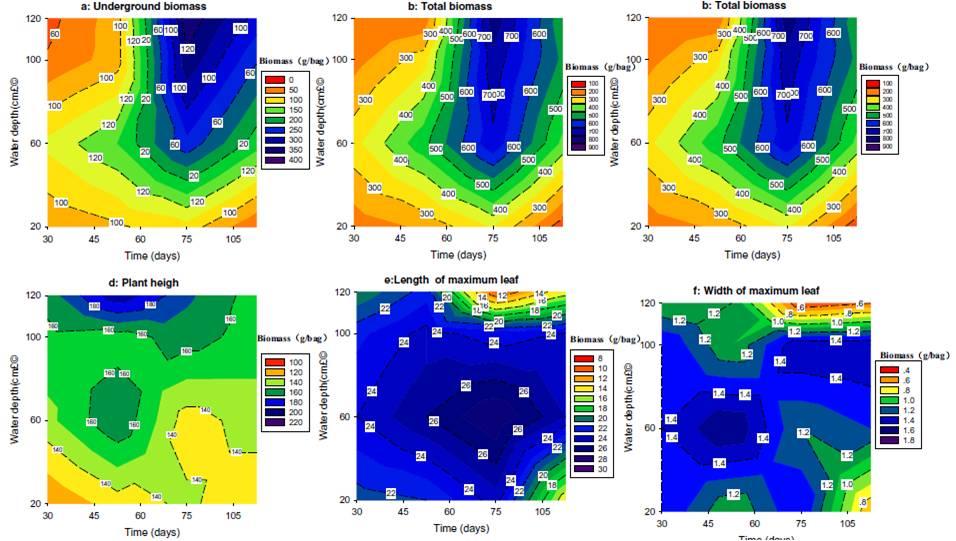 圖2、最大長度和寬度蘆葦樹葉的生物量隨時間和水深變化的二維等高線圖,研究周期為105天.