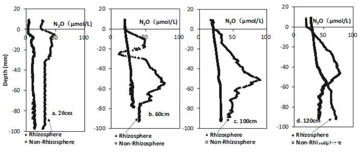 圖4、使用乙炔塊心孵化實驗中關于N2O排放的的完整剖面濃度分析圖。這些剖面圖分別記錄在蘆葦根際(根袋)與非根際(根袋外圍)的沉積物中氧化亞氮的排放情況。其中氧化亞氮的測試是先將10%的乙炔加到上覆水中和通過側向注入口注入到孔隙水后中等待3小時后完成測試的。其中三角形代表的是根際周圍,矩形代表的是非根際周圍。