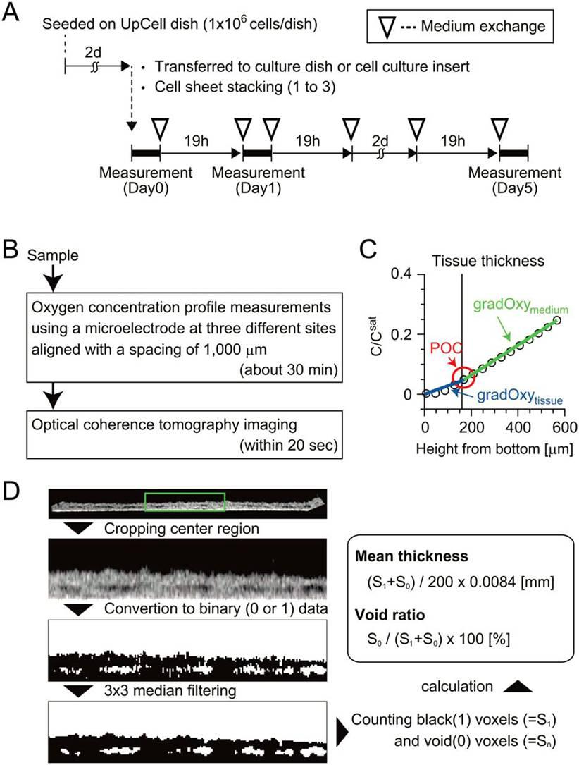 圖1、研究流程示意圖。圖(A)表示的是單個測試實驗的時間安排表。圖(B)表示的是應(yīng)用氧微電極測試培養(yǎng)的層狀細胞氧濃度剖面的測試方法。(C)測試一定厚度的含層狀細胞的氧剖面濃度確定的定三種參數(shù):POC(樣品中細胞周圍的氧濃度)、gradOxmedium(樣品中培養(yǎng)基中的氧梯度)gradOxytissuess(樣品中細胞組織的氧梯度)。圖(D)表示的是光學(xué)相干斷層掃描(OCT)系統(tǒng)獲得的橫斷層面截流動影像圖。