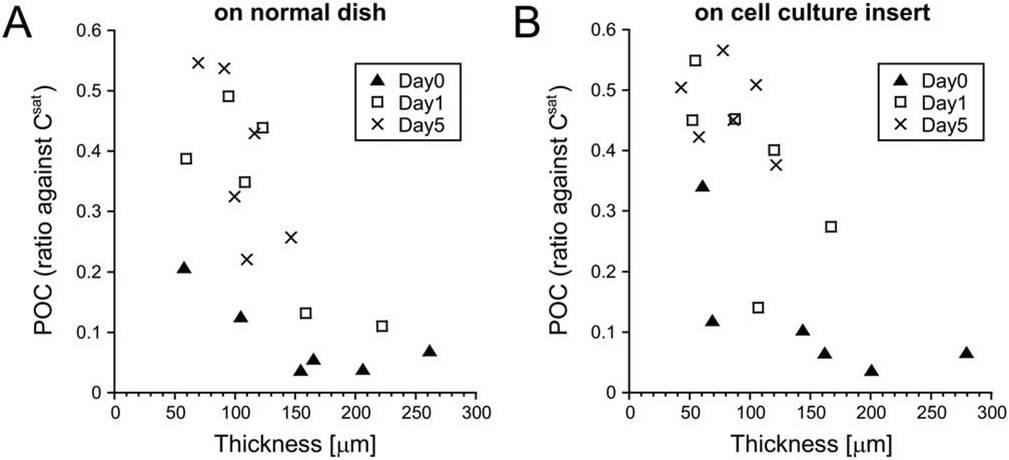 圖3、在0-5天的培養(yǎng)過程中測量的細胞組織樣品厚度、細胞培養(yǎng)時間、細胞周圍氧濃度(POCs)之間的相關(guān)性實驗。其中圖(A)在正常培養(yǎng)皿上進行細胞培養(yǎng);圖(B)在細胞培養(yǎng)池進行培養(yǎng)。其中圖中的第0天、第1天和第5天獲得的數(shù)據(jù)分別采用三角形、正方形及×形表示以便區(qū)分。