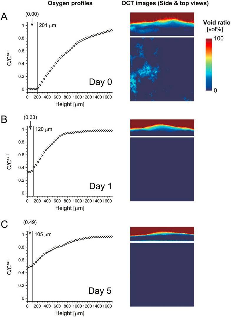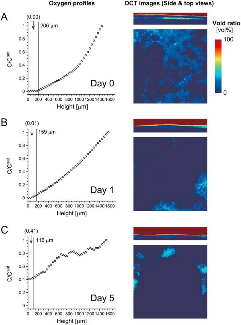 圖4、在單個實驗中使用細胞池培養(yǎng)的樣本獲得的數(shù)據(jù)。本論文中的實驗數(shù)據(jù)案例是在(A)第0天、(B)第1天和(C)第5天的三層成肌細胞樣本中獲得的數(shù)據(jù)。其中左邊左邊的圖表示的是氧的剖面濃度分布,右邊的圖表示的是采用了OCT系統(tǒng)獲得的橫斷層面影像圖。其中不同的空隙率值采用了不同的顏色表現(xiàn)出來。圓括號中的數(shù)值表示層狀細胞內(nèi)的氧濃度與培養(yǎng)基與空氣界面處的氧濃度(Csat)的比值。
