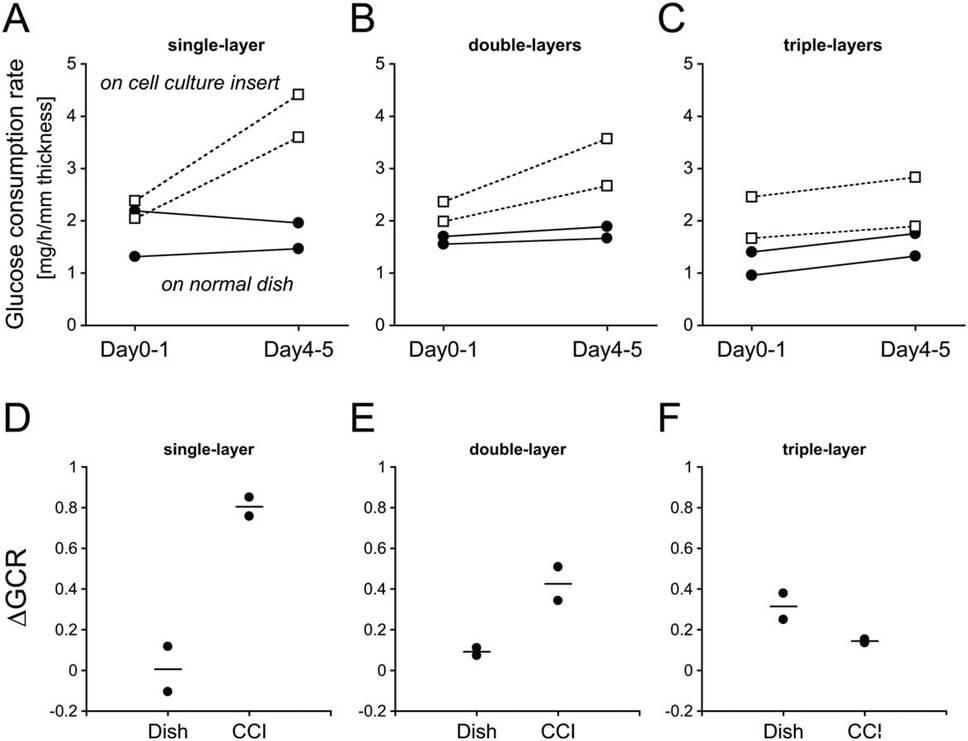 圖5、提出用葡萄糖消耗率來評價層狀細胞的活力指數(shù)。其中圖(A-C)表示的是培養(yǎng)單、雙、三層的細胞組織所需的葡萄糖消耗速率。其中的細胞組織的培養(yǎng)是正常的培養(yǎng)皿(●)或細胞池(□)上培養(yǎng)。圖中的所獲得的實驗點是根據(jù)測量所用的時間間隔繪制的。圖(D-F)表示的△GCR指數(shù)定義為DGCRDay 4-5-GCR Day 0-1]/GCR Day0-1,其中的獲取的數(shù)據(jù)是分別從單層、雙層和三層細胞組織中獲得的,橫坐標表的是在正常的培養(yǎng)皿中和在細胞池中進行培養(yǎng)的方法。