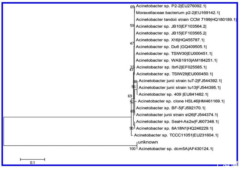 圖2、來自于國家生物技術(shù)信息中心基因庫分析的16S-rRNA序列的目標(biāo)菌株與密切相關(guān)的細(xì)菌之間的系統(tǒng)關(guān)系。參考序列的數(shù)據(jù)庫加入數(shù)量在應(yīng)變名稱后顯示。這些數(shù)字表明目前的引導(dǎo)支持是基于對1000個重新采樣數(shù)據(jù)集的鄰接分析。隔離帶的基因庫數(shù)量是KX928708。