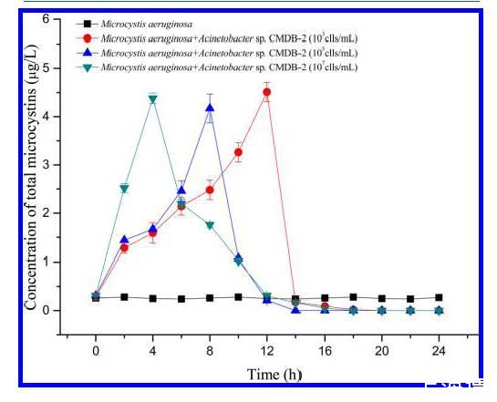 圖5、體系中含有不同的初始細(xì)菌密度條件下,微囊藻菌屬FACHB905動態(tài)MC-LR微囊濃度的和不動桿菌中的動態(tài)濃度變化。圖中顯示的數(shù)據(jù)代表了是實際測試值三倍的平均值。