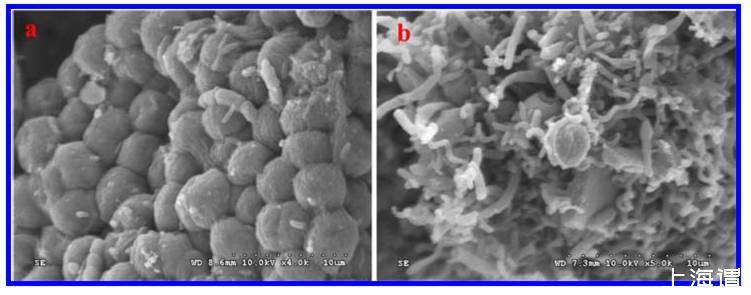 圖3、24小時后,在(a)參照對比組和(b)藻/細(xì)菌共培養(yǎng)系統(tǒng)中掃描電子顯微鏡圖像的微囊藻菌FACHB905和單一不動桿菌的掃描顯微鏡示意圖。
