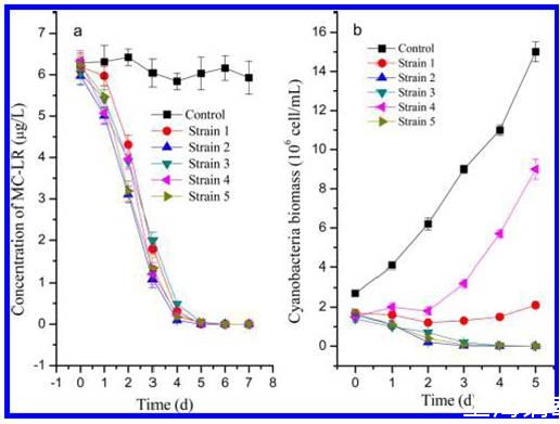 圖1、(a)MC-LR(微囊藻素)濃度和(b)細(xì)菌隔離實驗中微囊藻細(xì)胞密度的動態(tài)變化。數(shù)據(jù)代表是實際測試后三倍的平均值。