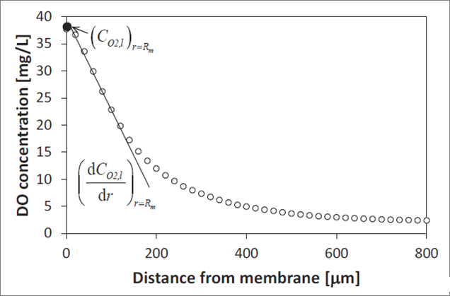 圖2、臨近生物膜膜傳質邊界層附件的溶液中的溶解氧濃度代表性測試氧濃度剖面圖。其中圖中的縱坐標表示的溶液中溶氧的濃度,橫坐標表示的是距離生物膜表面不同距離的膜傳質邊界層。從圖中可以看出,該剖面是一個典型的膜傳質邊界層溶氧濃度剖面分布圖。從圖中可以看出,邊界質層溶氧中的溶氧濃度會隨著離生物膜的距離增加而變小。