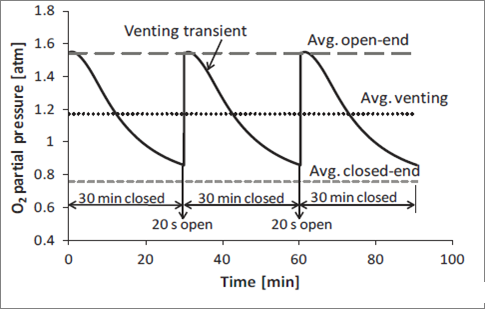 圖4、在曝氣膜反應其中進行階段曝氣時,不同階段的氧分壓濃度變化隨時間的變化情況。其中實線表示的是暫停時段,虛線表示的是階段曝氣的三個循環周期的平均時間,灰色的短虛線表示的是封閉穩態下反應器內的氧分壓。長的虛線表示的是開放穩態下反應器內的氧分壓。